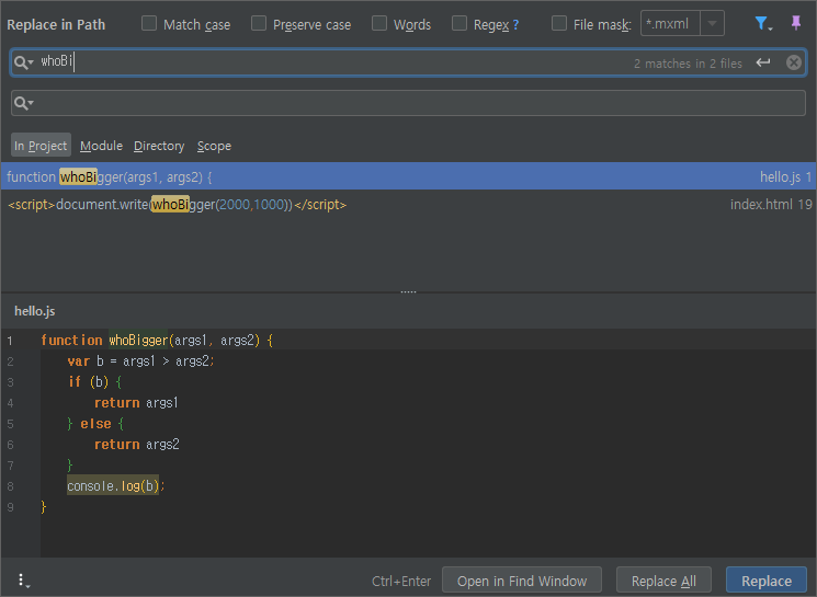 함수명등 이름을 변경하고 싶을 경우 수동으로 Find in Path(프로젝트 안에서 찾기, Ctrl+Shift+F) 나 Replace in Path(프로젝트 안에서 바꾸기)로도 할 수 있지만, 필요한 부분 또는 필요하지 않은 부분이 바뀔 수도 있다.