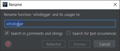 변경하고 싶은 변수나 클래스 함수명에 커서를 두고 Shift+F6 입력 시 나타나는 Rename 창