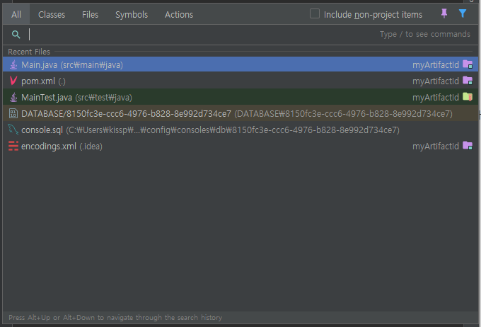 상단에 All, Classes, Files, Symbols, Actions등 구분도 있으므로 편하게 파일을 찾을 수 있다.