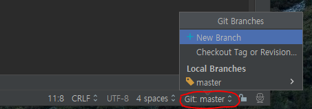 오른쪽 하단의 Git:master or Git:브랜치명 을 클릭하여 새로운 브랜치를 만들거나 브랜치를 변경할 수 있다.