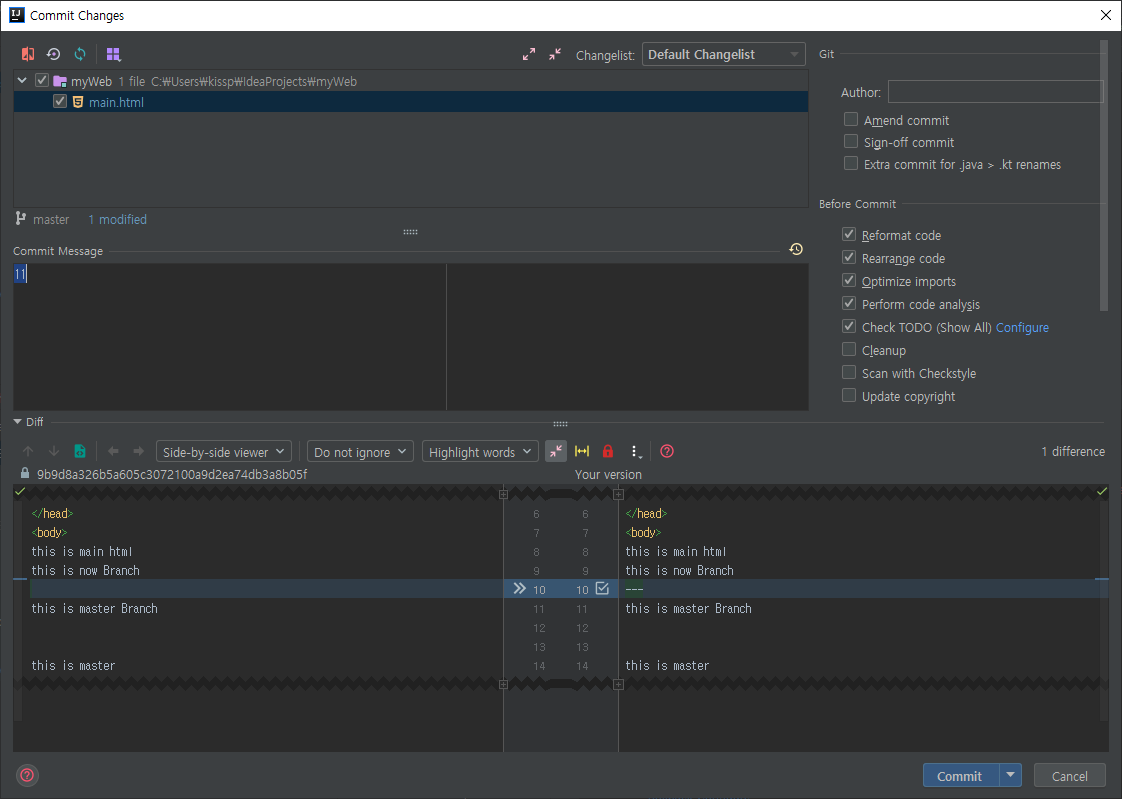 내용을 수정하여 커밋 (Ctrl+K) 입력 시 Commit Changes 창 하단에 git의 소스와 변경한 로컬의 소스를 비교하여 보여준다. 이때 그 창에서 소스를 수정할 수 있는데, 자물쇠 아이콘을 클릭하여 수정할 수 있다. 오른쪽의 소스가 현재 로컬의 소스.
