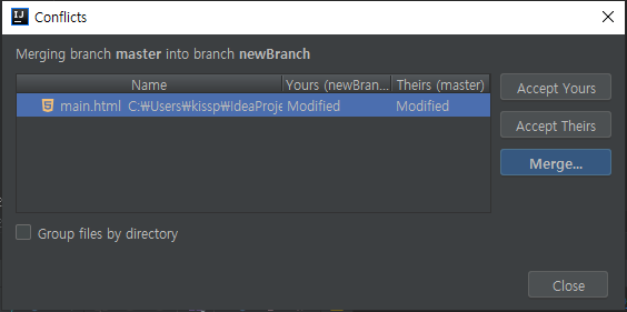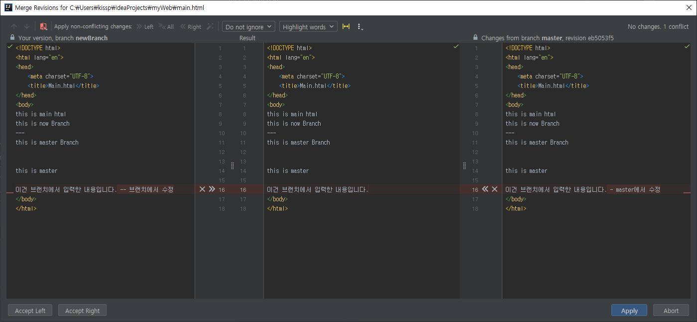 만약 충돌이 일어날 경우 충돌되는 소스를 보여주고 사용자가 직접 merge 할 수 있게 해준다.