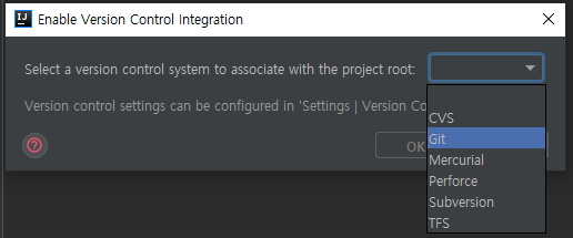 VCS 메뉴 > Enable Version Control Integration...에서 Git을 선택 하면 Git init이 실행되고 선택한 프로젝트의 저장소가 초기화 된다. (이미 초기화 했다면 메뉴가 보이지 않을 것이며 할 필요가 없다.)