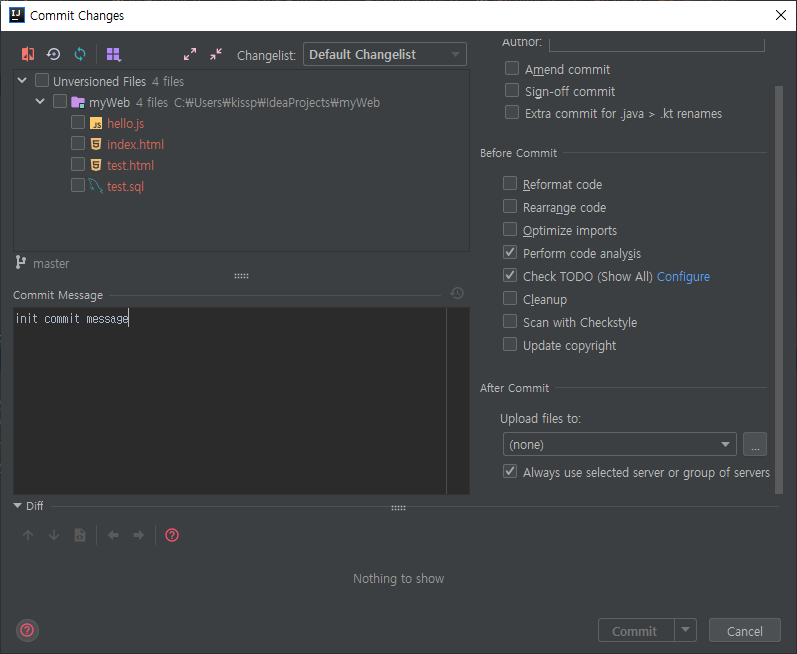 - Before Commit - Perform code analysis : 커밋 전 구문 에러나 비효율적인 코드를 알려준다.