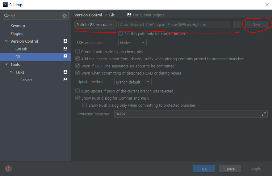 인텔리제이 설정화면(Ctrl+Alt+s)으로 들어가 git 경로가 세팅되어 있는지 확인한다. Test버튼을 눌러 연결되었는지 확인 가능.
