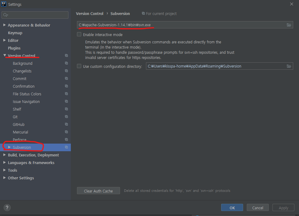 Settings > Version Control > Subversion 설정화면에서 압축해제한 폴더의 svn.exe 경로를 입력한다.