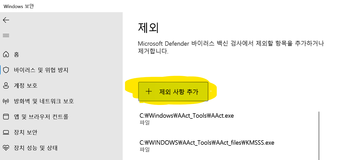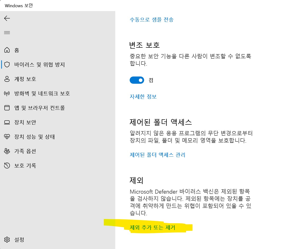 설정 > Windows 보안 > 바이러스 및 위협 방지 > 바이러스 및 위협 방지 설정 > 제외