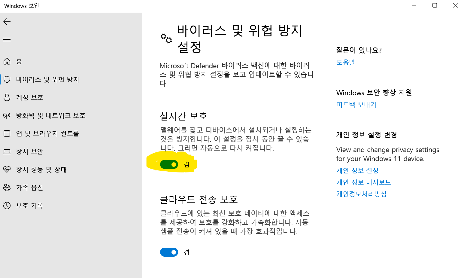 실시간 보호를 해제하니 정상적으로 작동하였다.