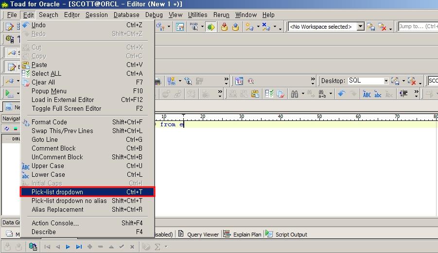 Toad에서는 Editor창에서 쿼리를 작성할 때 오브젝트 명이나 컬럼 명을 자동으로 완성해주는 Code Insight Pick List를 제공합니다.